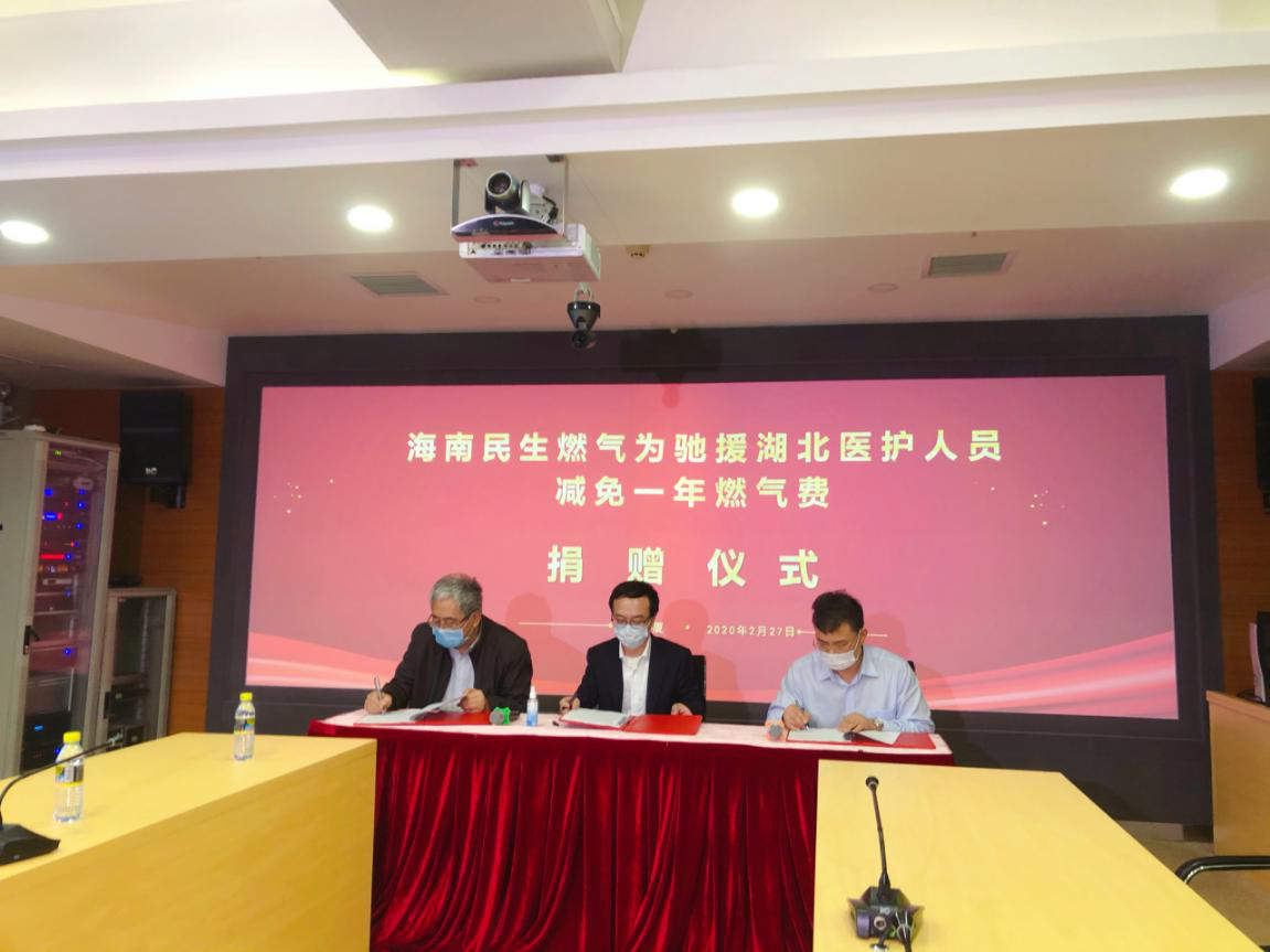 2月27日,“民生燃氣為馳援湖北醫護人員減免燃氣費捐贈儀式”在民生大廈舉行,海南省住房和城鄉建設廳廳長霍巨燃、海南省衛生健康委員會副主任周國明及民生燃氣相關領導出席此次捐贈活動。根據協議,民生燃氣自2020年2月份起為其經營區域內的所有援鄂醫護人員減免一年(2020年2月1日-2021年1月31日)管道燃氣費,包括海口地區非管道燃氣用戶也可免費享受一年瓶裝液化氣服務。