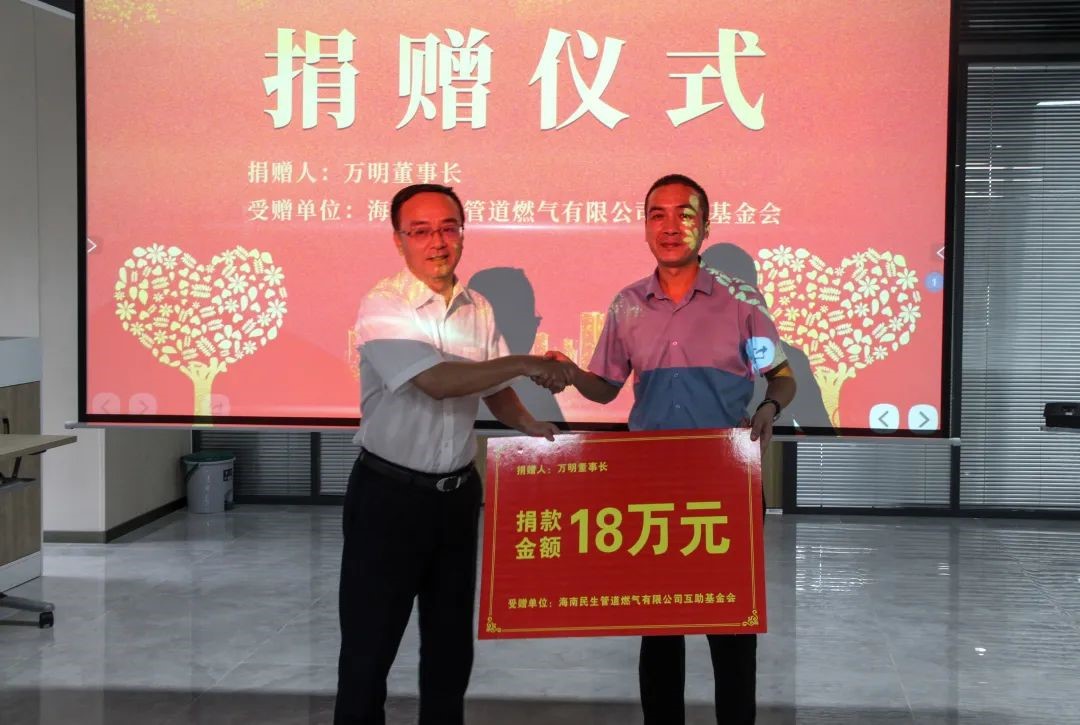 9月16日,民生眾和集團工會第一屆第二次職工代表大會順利召開。萬明董事長以個人名義向海南民生燃氣互助基金會捐贈幫扶資金18萬元。