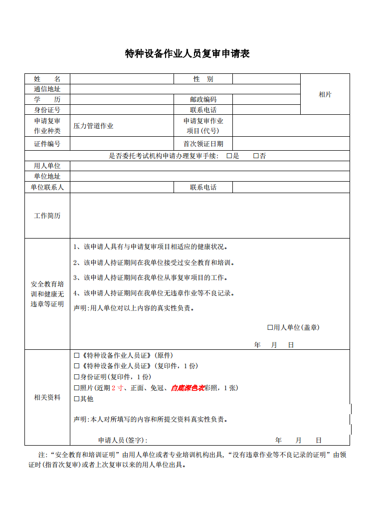 1、參加培訓人員如實填寫特種設備作業考試申請表1份;